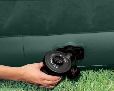Надувной матрас серии "Престиж". Цвет зеленый. Флокированное покрытие не даёт соскальзывать белью, и в тоже время легко чистится. Клапан 3-в-1. В комплект входит насос, работающий от батареек.