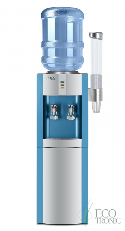 Кулер для воды Ecotronic H1-LC - базовая модель, цвет корпуса - металлик с синими вставками. Современный дизайн. В нижней части кулера Ecotronic H1-LC - удобный шкафчик для хранения принадлежностей на 16 л.